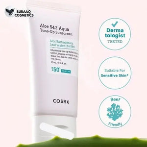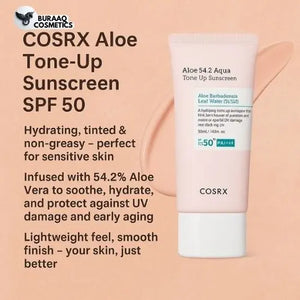 The COSRX Aloe 54.2 Aqua Tone-Up Sunscreen SPF 50+ PA++++ is a lightweight, moisturizing, and tone-enhancing sunscreen that keeps your skin fresh, bright, and protected under the sun 🌞💧.
